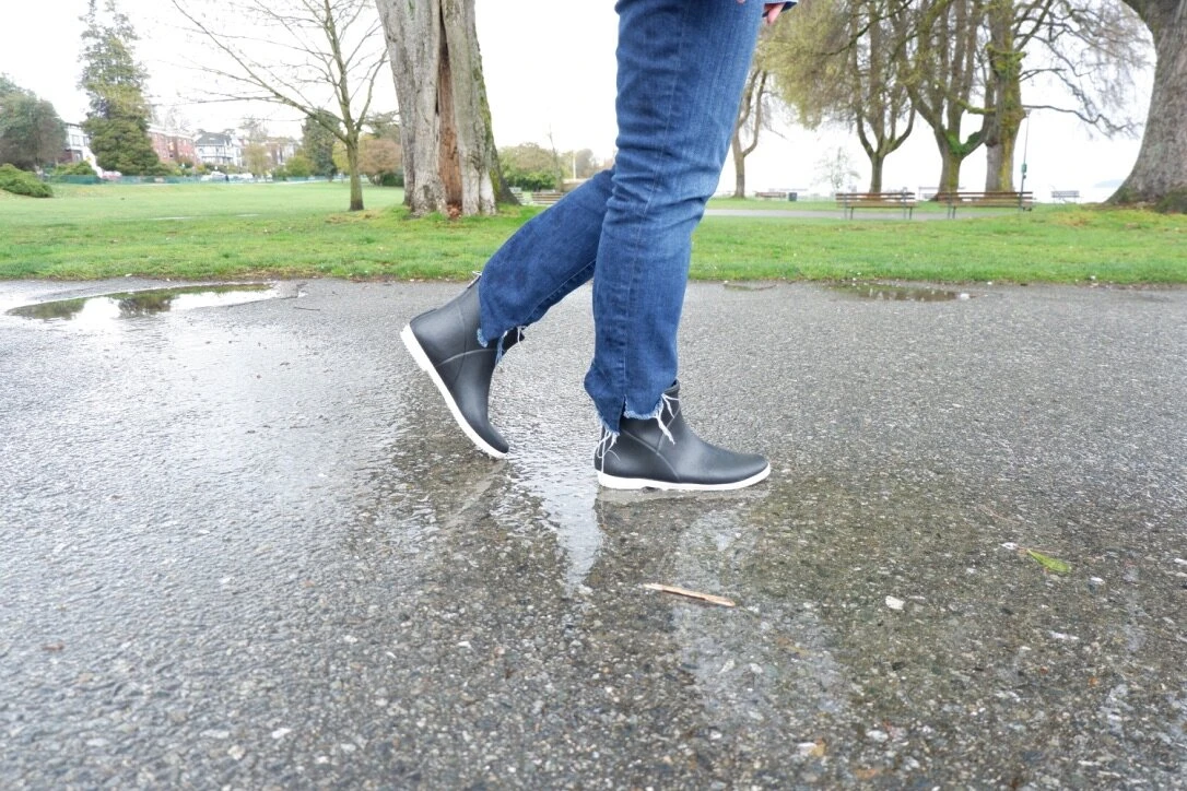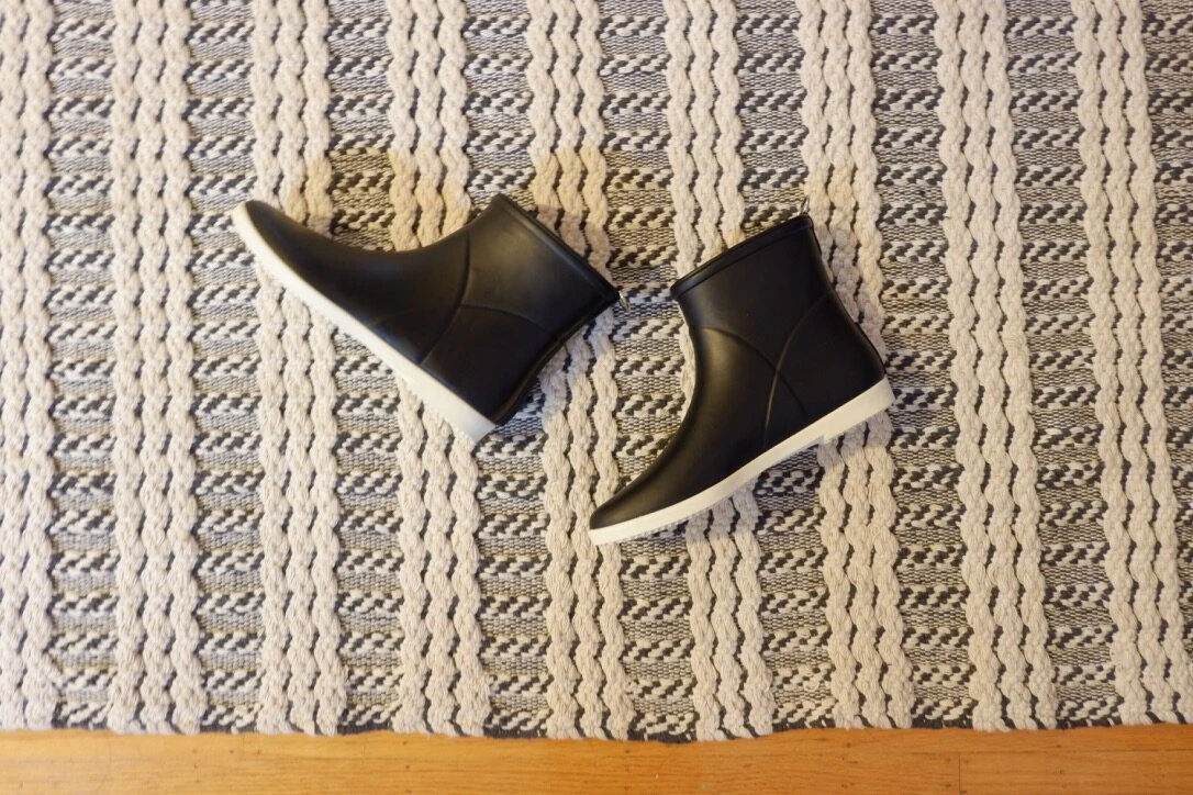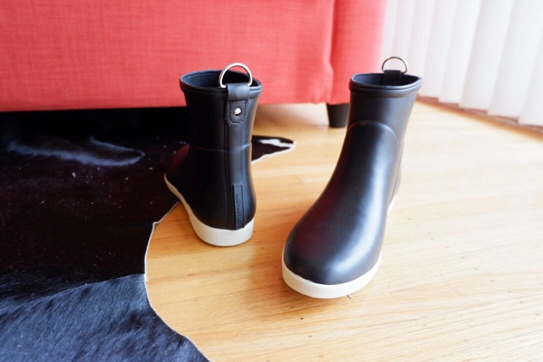I picked out the minimalist black + white ankle rain boot because I like its clean, sleek profile and the little touch of contrast it provides with its white soles. I love how black goes with everything, so it probably saves me three seconds of deciding whether my outfit matches or not every day. I also appreciate the high ankle cut, and while it does seem like water can still get in since the openings seem a bit large even with my feet in, I’ve never experienced any problems with them or had my socks/feet wet.