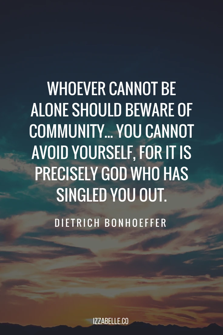“Every day brings the Christian many hours of being alone in an unchristian environment. These are times of testing. This is the proving ground of a genuine time of meditation and genuine Christian community. Has the community served to make individuals free, strong and mature, or has it made them insecure and dependent? […] Has it made them anxious and unsure?”