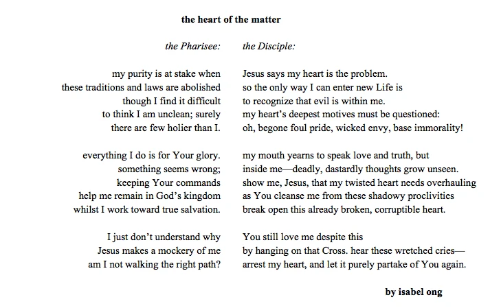 My poem imagines the responses to Jesus’ parable in Mark 7:14-23 from the perspectives of a Pharisee and a disciple, and also conveys a “hidden” third voice—representing the poet and/or the contemporary reader—through a horizontal reading of the text.