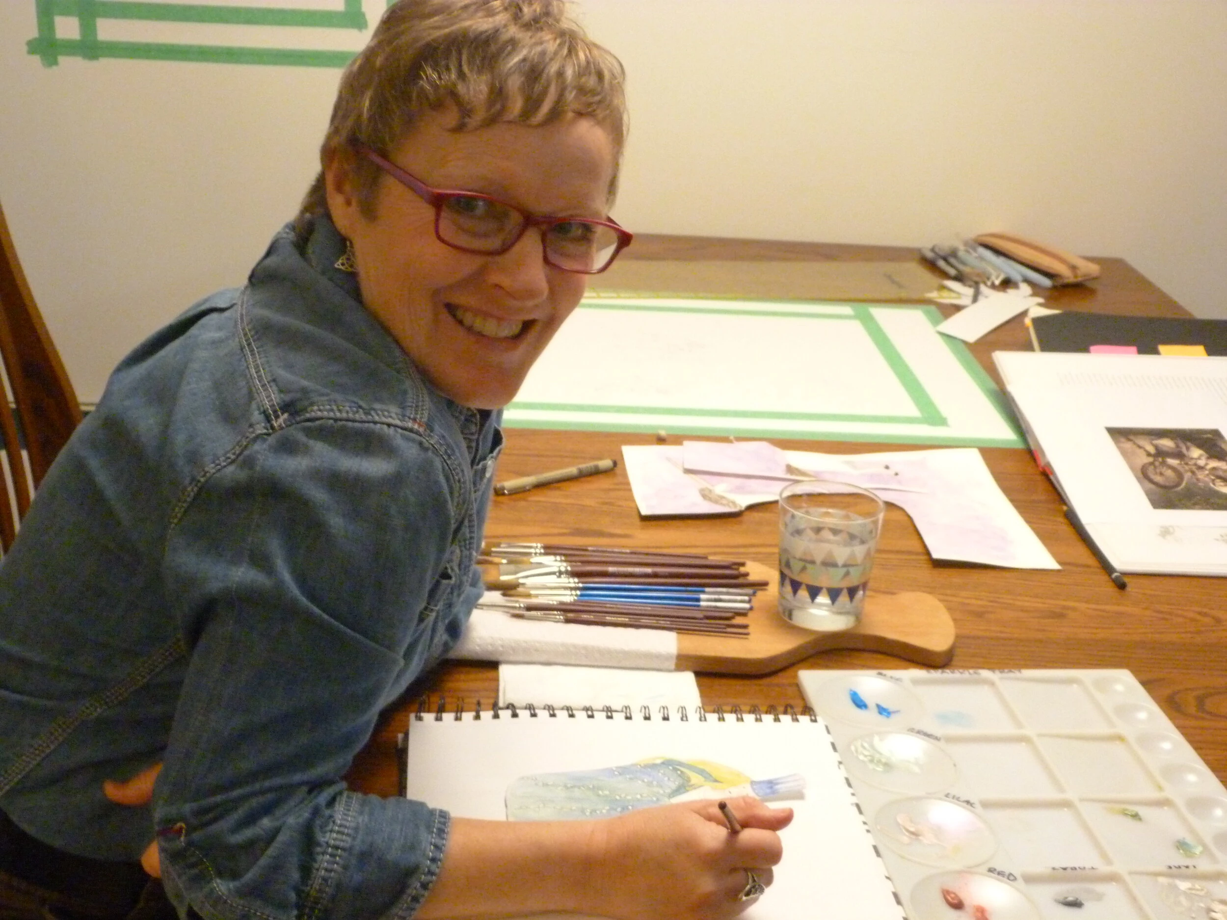 My dining room table is big enough to accommodate two 18”X24” pieces of paper. I keep one taped down so I can add a glazed layer while the potatoes are cooking or if I have 10 minutes, I grab my sketch book and square off a colour palette with the sparkly iridescent paints I bought last week. I rarely finish a painting or sketch in one sitting. If I’m travelling, I bring my sketch book and a travel paint set. It’s been fun inviting people I meet to draw or paint something in my book. The best of souvenirs!