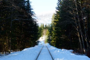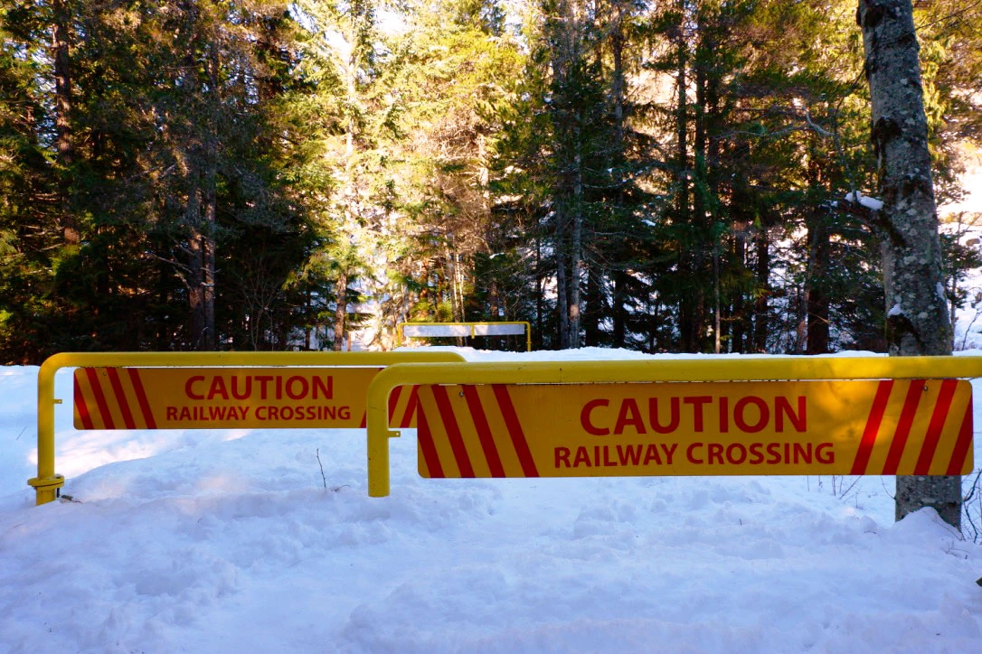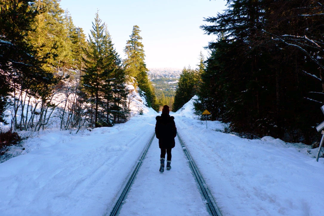 The second stop we made was at Brandywine Falls, which took us about an hour and a half to get there. This was a little iffy because the carpark was completely snowed under and cars had to park at a small strip of road along the highway. We made a split-second decision to go exploring here, and I am SO glad we did. If not, we wouldn’t have been treated to a beautiful rainbow appearing before our eyes at the waterfall’s viewpoint area, or the snow-covered railway tracks stretching as far as the eye could see.